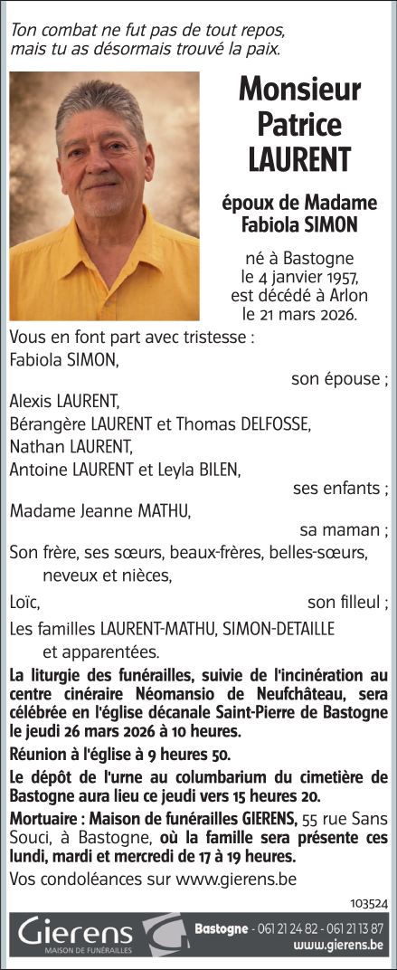 Décédé à Arlon (6700) le samedi 21 mars 2026 à l'âge de 69 ans
