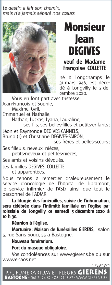 Décédé à Bastogne (6600) le mercredi 2 décembre 2020 à l'âge de 74 ans