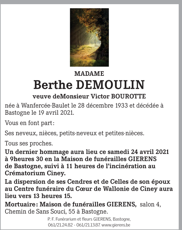 Décédée à Bastogne (6600) le lundi 19 avril 2021 à l'âge de 87 ans