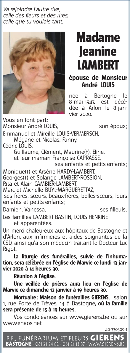 Décédée à Arlon (6700) le mercredi 8 janvier 2020 à l'âge de 72 ans
