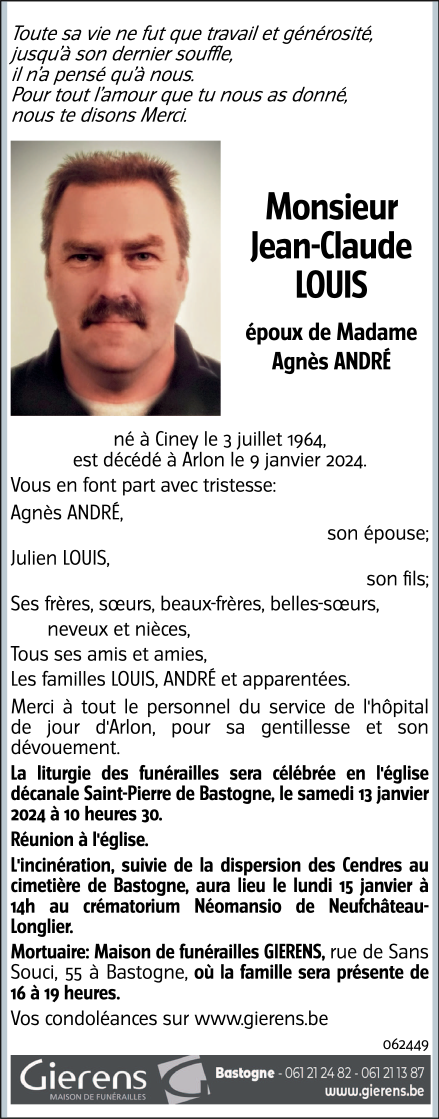 Décédé à Arlon (6700) le mardi 9 janvier 2024 à l'âge de 59 ans