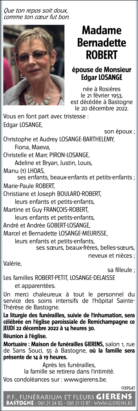 Décédée à Bastogne (6600) le mardi 20 décembre 2022 à l'âge de 69 ans