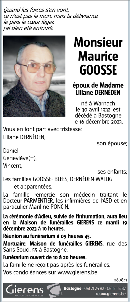 Décédé à Bastogne (6600) le samedi 16 décembre 2023 à l'âge de 91 ans