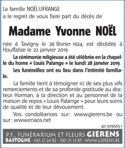 Décédée à Houffalize (6660) le mardi 22 janvier 2019 à l'âge de 94 ans