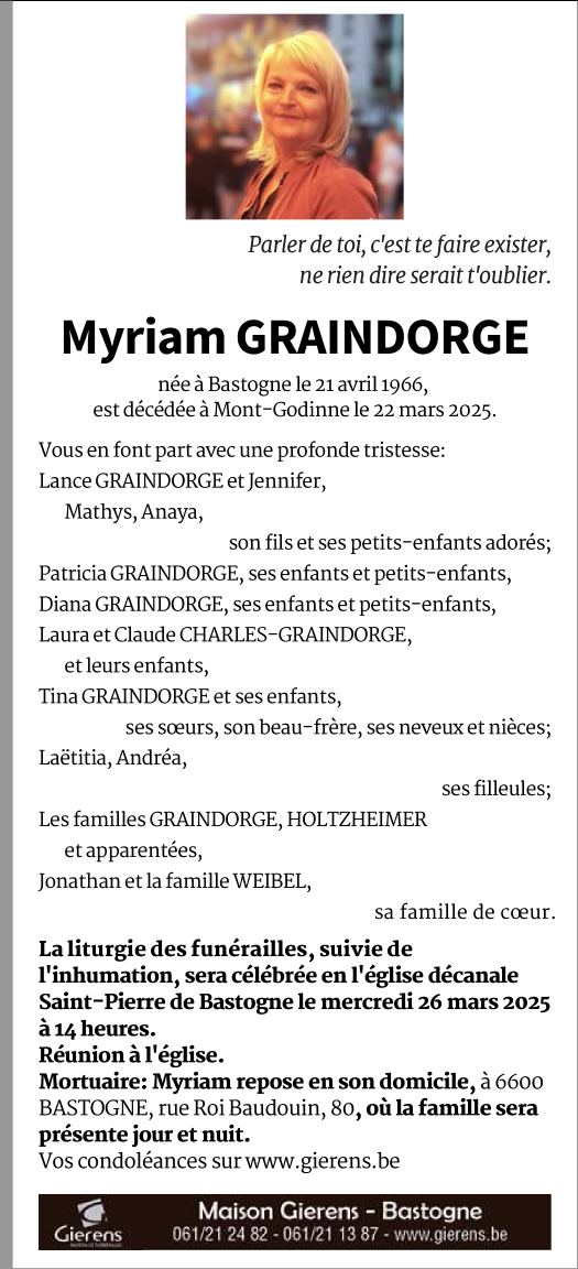 Décédée à Yvoir (5530) le samedi 22 mars 2025 à l'âge de 58 ans