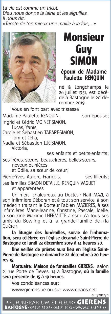 Décédé à Bastogne (6600) le vendredi 20 décembre 2019 à l'âge de 68 ans