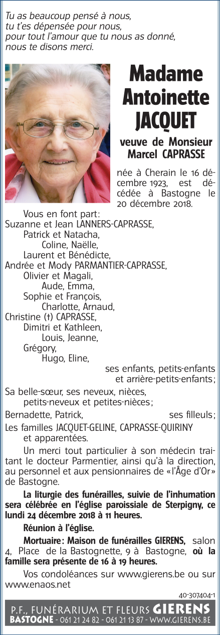 Décédée à Bastogne (6600) le jeudi 20 décembre 2018 à l'âge de 95 ans