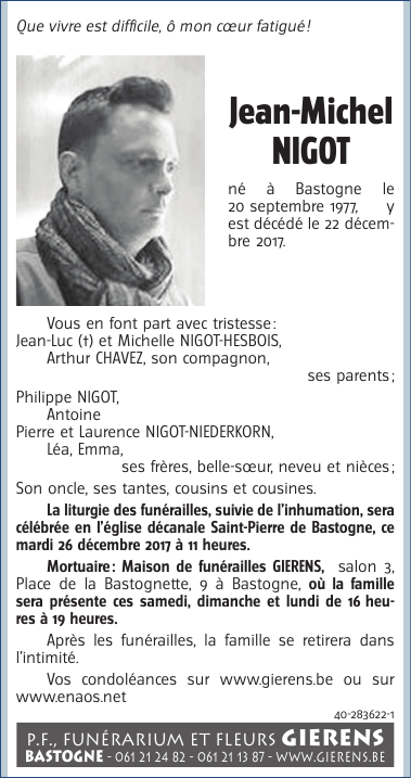 Décédé à Bastogne (6600) le vendredi 22 décembre 2017 à l'âge de 40 ans