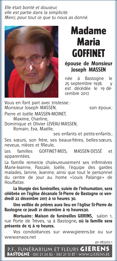 Décédée à Bastogne (6600) le mardi 19 décembre 2017 à l'âge de 79 ans