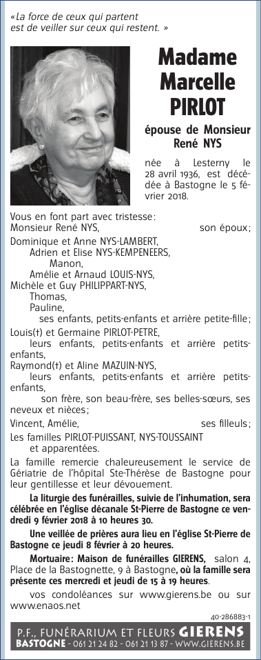 Décédée à Bastogne (6600) le lundi 5 février 2018 à l'âge de 81 ans