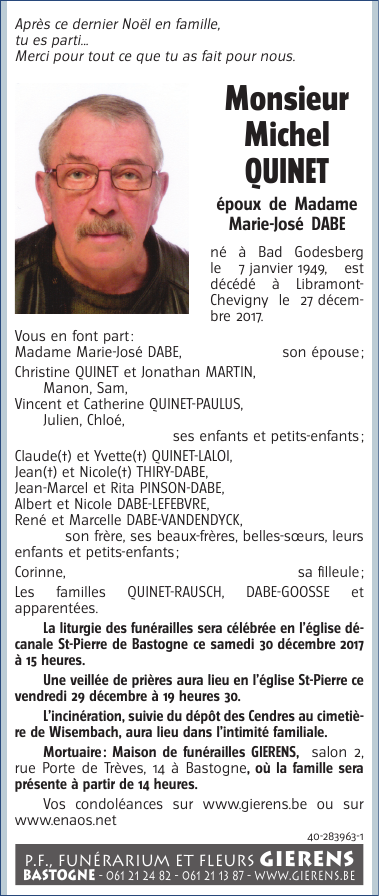 Décédé à Libramont (6800) le mercredi 27 décembre 2017 à l'âge de 68 ans