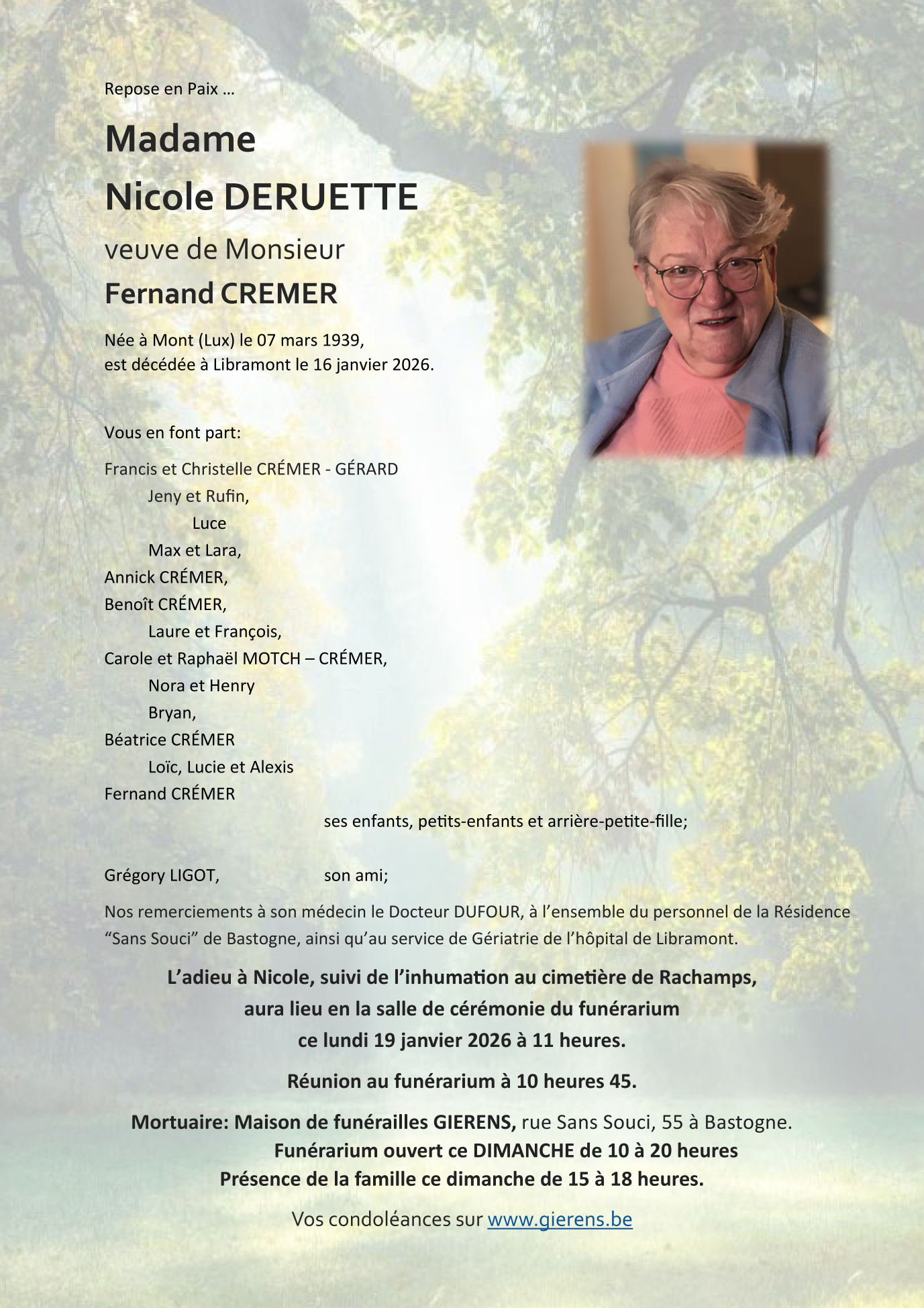 Décédée à Libramont-Chevigny (6800) le vendredi 16 janvier 2026 à l'âge de 86 ans