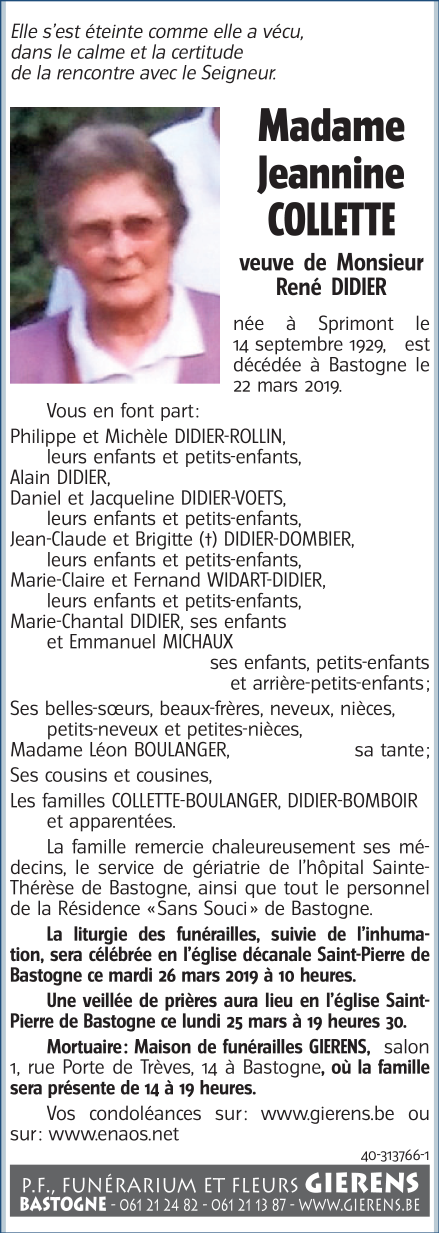 Décédée à Bastogne (6600) le vendredi 22 mars 2019 à l'âge de 89 ans