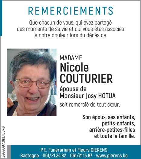 Décédée à Bastogne (6600) le mercredi 1 mai 2019 à l'âge de 82 ans