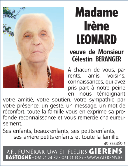Décédée à Saint-Hubert (6870) le lundi 15 février 2021 à l'âge de 88 ans