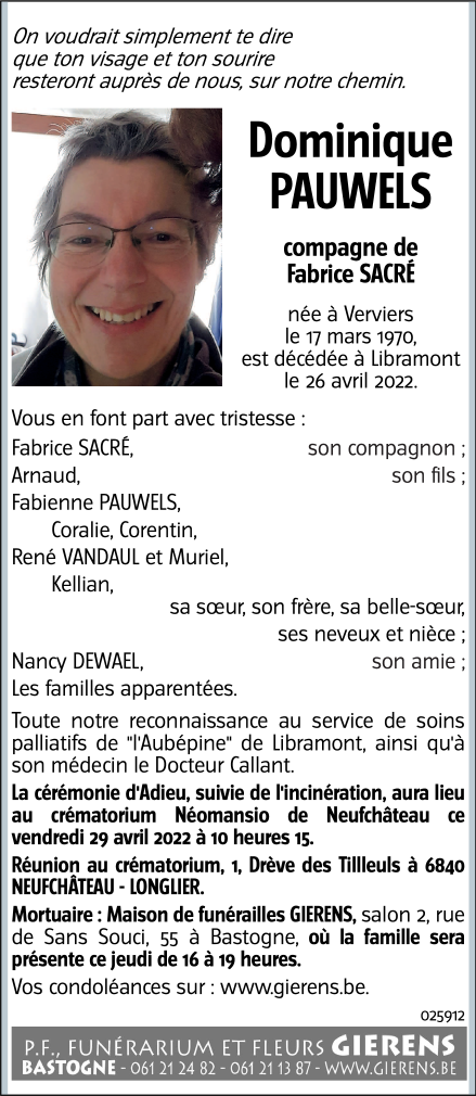 Décédée à Libramont-Chevigny (6800) le mardi 26 avril 2022 à l'âge de 52 ans