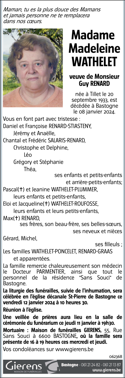 Décédée à Bastogne (6600) le lundi 8 janvier 2024 à l'âge de 90 ans