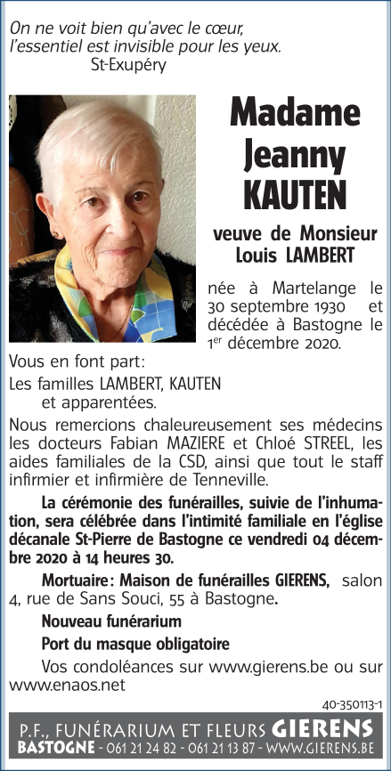 Décédée à Bastogne (6600) le mardi 1 décembre 2020 à l'âge de 90 ans