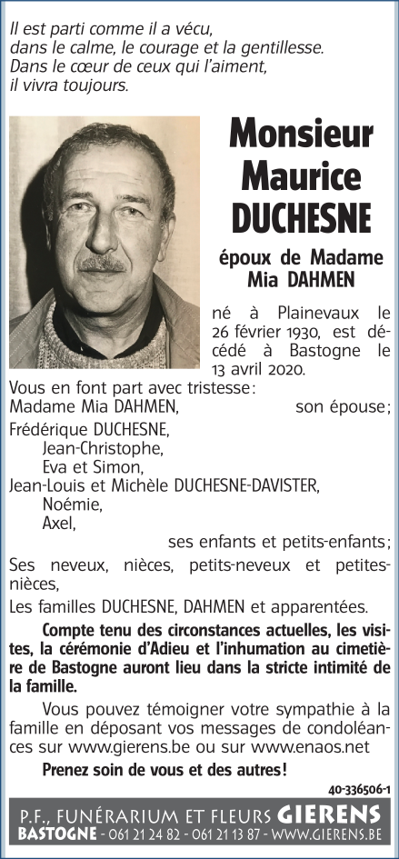 Décédé à Bastogne (6600) le lundi 13 avril 2020 à l'âge de 90 ans