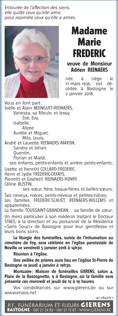 Décédée à Bastogne (6600) le mardi 2 janvier 2018 à l'âge de 81 ans