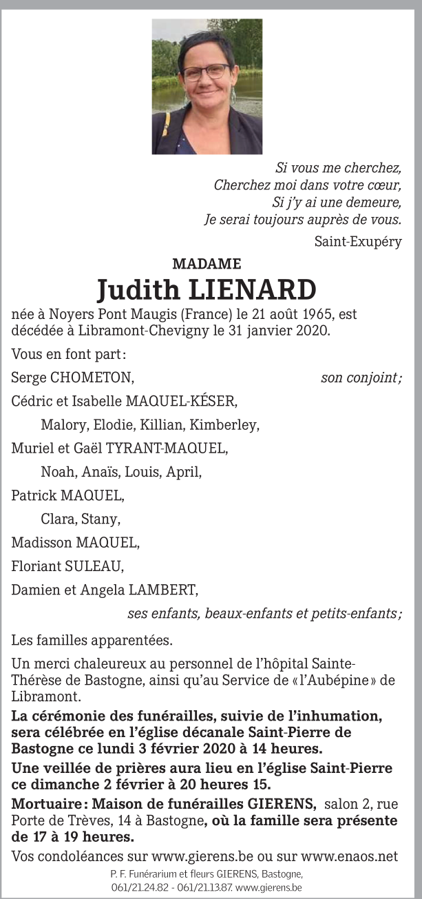 Décédée à Libramont-Chevigny (6800) le vendredi 31 janvier 2020 à l'âge de 54 ans