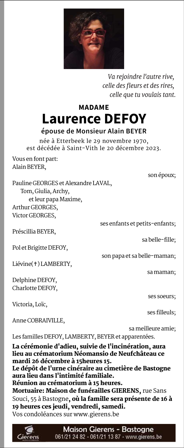 Décédée à Saint-Vith (4780) le mercredi 20 décembre 2023 à l'âge de 53 ans