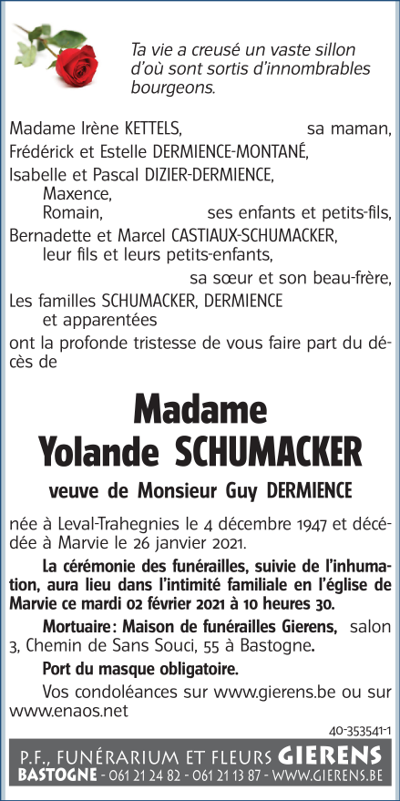 Décédée à Bastogne (6600) le mardi 26 janvier 2021 à l'âge de 73 ans