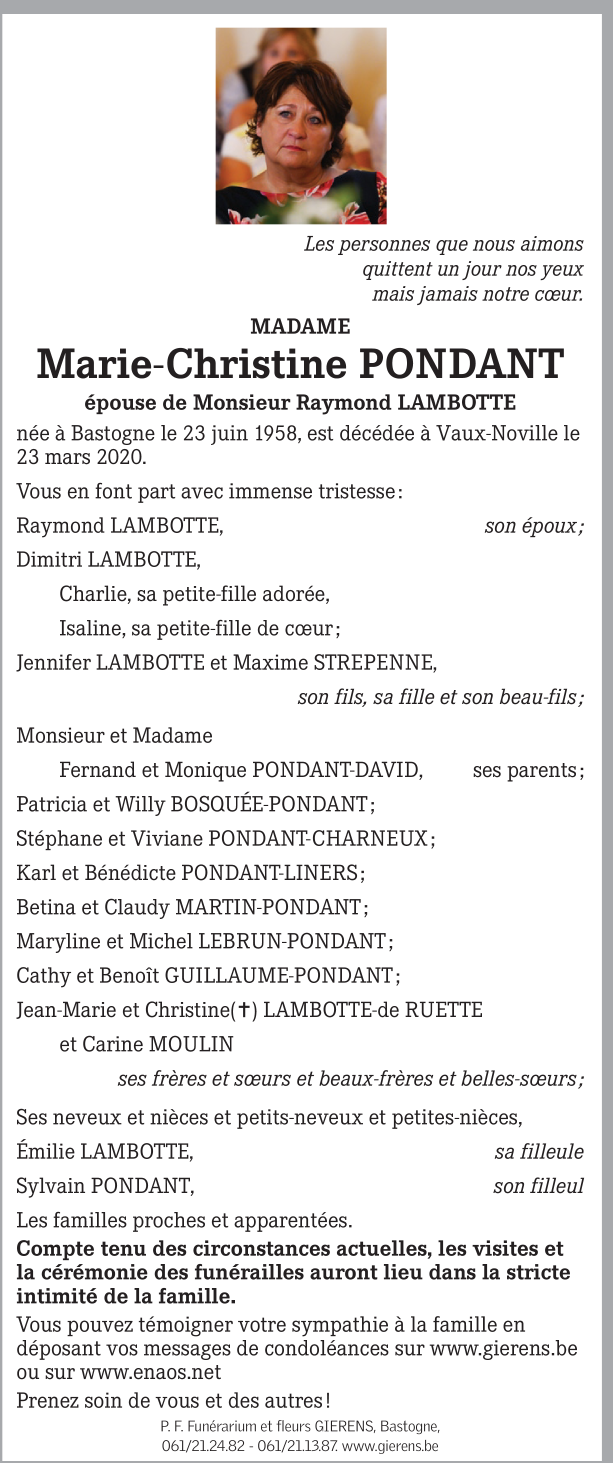 Décédée à Bastogne (6600) le lundi 23 mars 2020 à l'âge de 61 ans