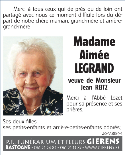 Décédée à Bastogne (6600) le dimanche 19 avril 2020 à l'âge de 100 ans