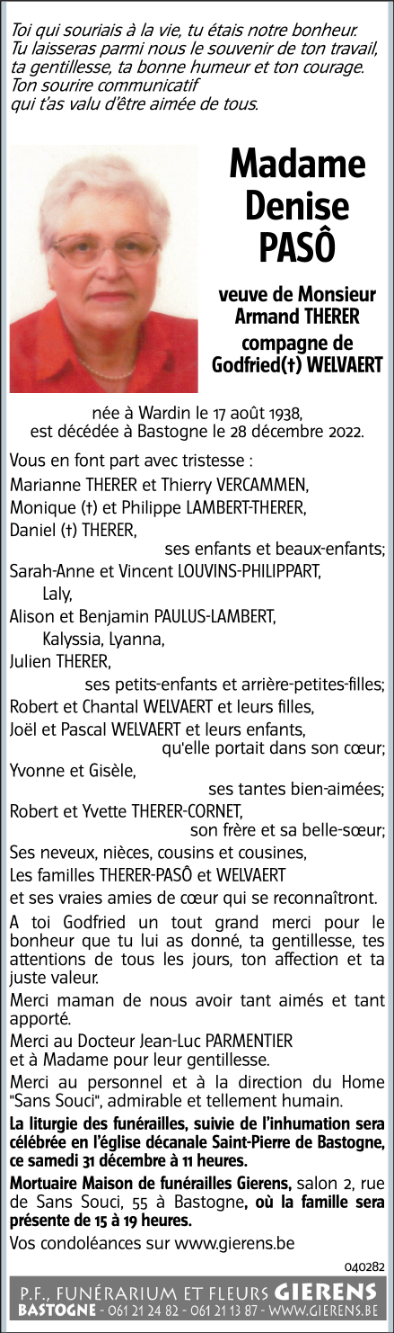 Décédée à Bastogne (6600) le mercredi 28 décembre 2022 à l'âge de 84 ans