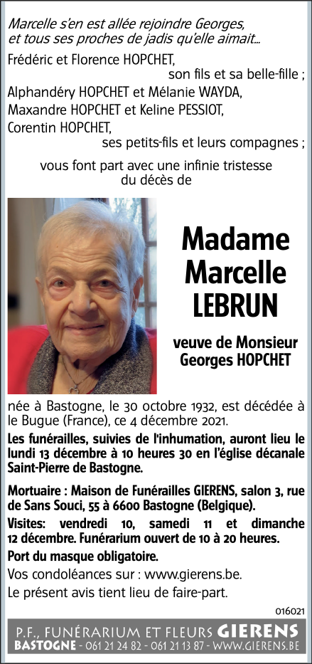 Née à Bastogne (6600) le dimanche 30 octobre 1932