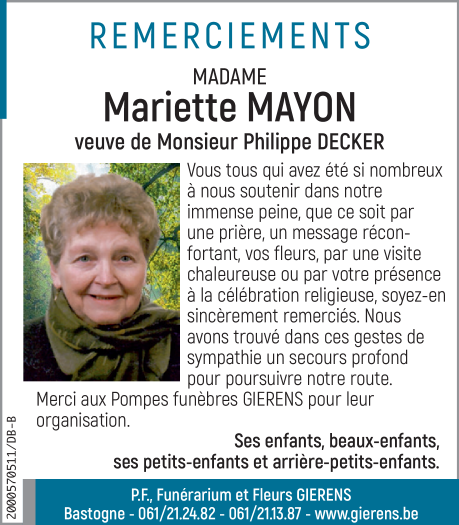 Décédée à Bastogne (6600) le lundi 13 janvier 2020 à l'âge de 91 ans