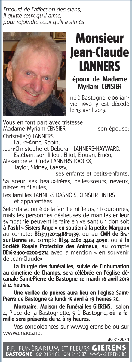 Décédé à Bastogne (6600) le samedi 13 avril 2019 à l'âge de 69 ans