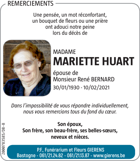Décédée à Bastogne (6600) le mercredi 10 février 2021 à l'âge de 91 ans
