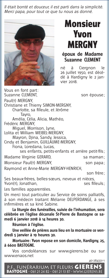 Né à Ciergnon (5560) le mercredi 26 juillet 1950