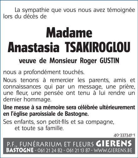 Décédée à Bastogne (6600) le samedi 4 avril 2020 à l'âge de 94 ans