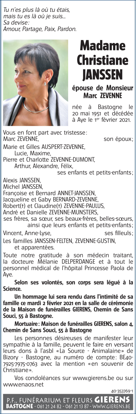 Décédée à Marche-en-Famenne (6900) le lundi 1 février 2021 à l'âge de 69 ans