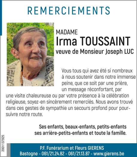 Décédée à Bastogne (6600) le vendredi 29 avril 2022 à l'âge de 93 ans