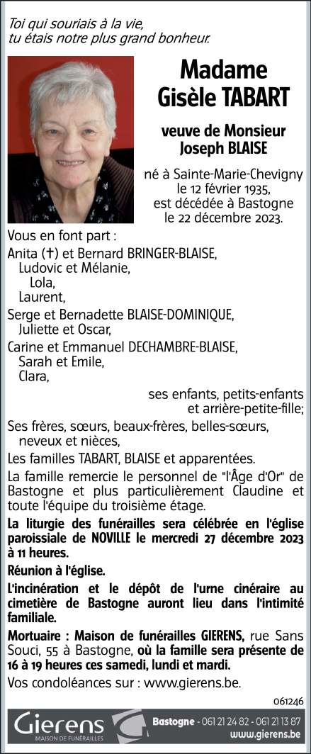 Décédée à Bastogne (6600) le vendredi 22 décembre 2023 à l'âge de 88 ans