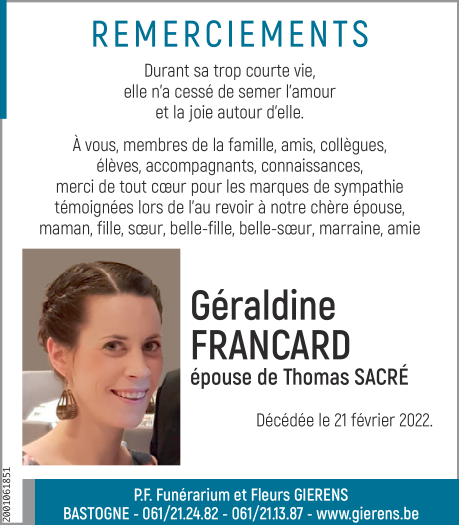 Décédée à Libramont-Chevigny (6800) le lundi 21 février 2022 à l'âge de 37 ans