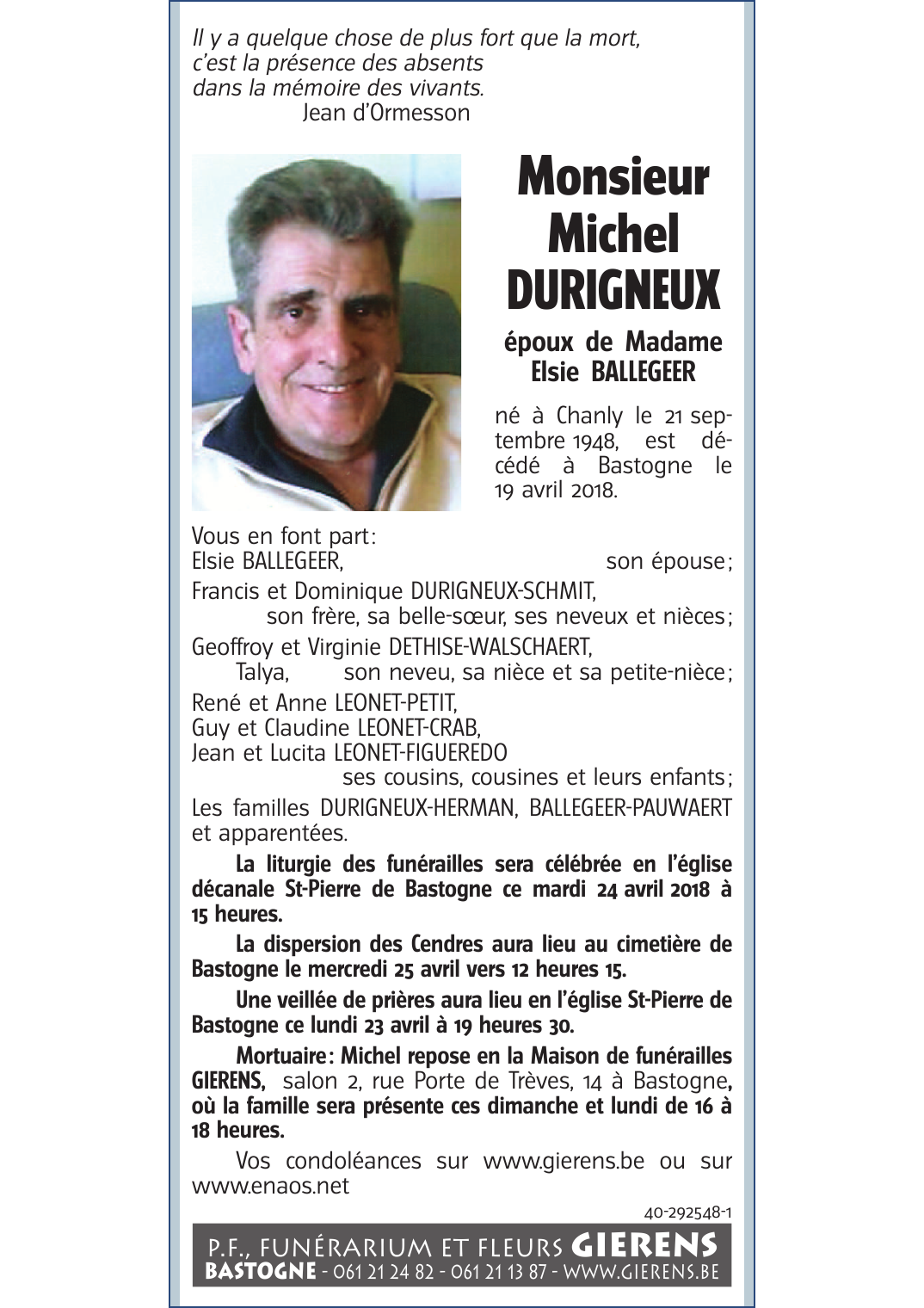 Décédé à Bastogne (6600) le jeudi 19 avril 2018 à l'âge de 69 ans