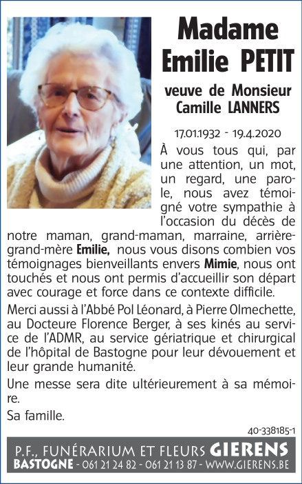 Décédée à Bastogne (6600) le dimanche 19 avril 2020 à l'âge de 88 ans