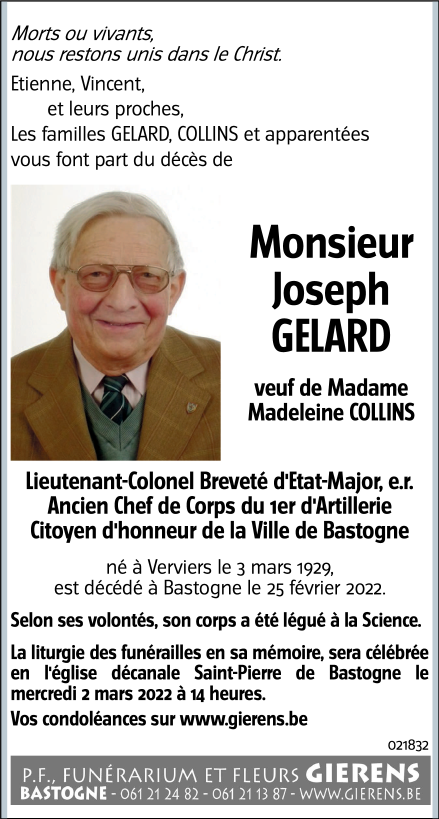 Décédé à Bastogne (6600) le vendredi 25 février 2022 à l'âge de 92 ans