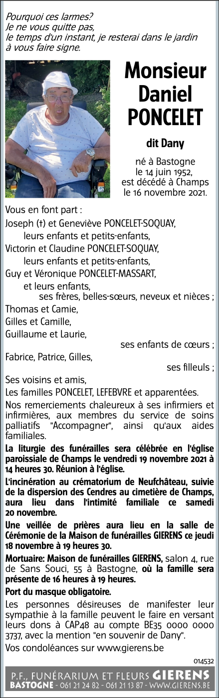 Décédé à Bertogne (6687) le mardi 16 novembre 2021 à l'âge de 69 ans