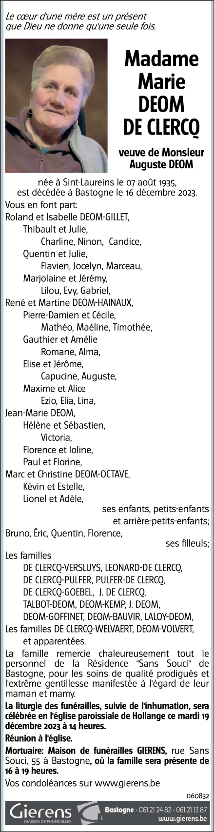 Décédée à Bastogne (6600) le samedi 16 décembre 2023 à l'âge de 88 ans