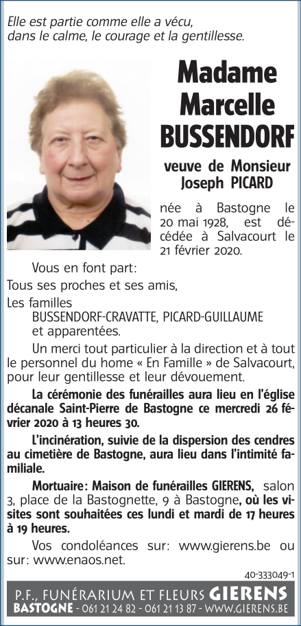 Décédée à Vaux-sur-Sure (6640) le vendredi 21 février 2020 à l'âge de 91 ans