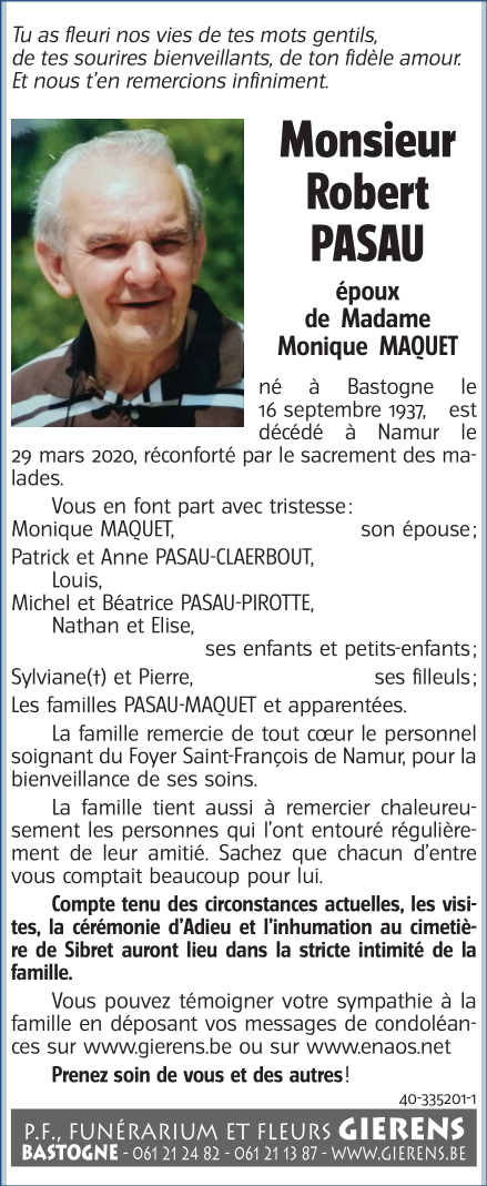 Décédé à Namur (5000) le dimanche 29 mars 2020 à l'âge de 82 ans