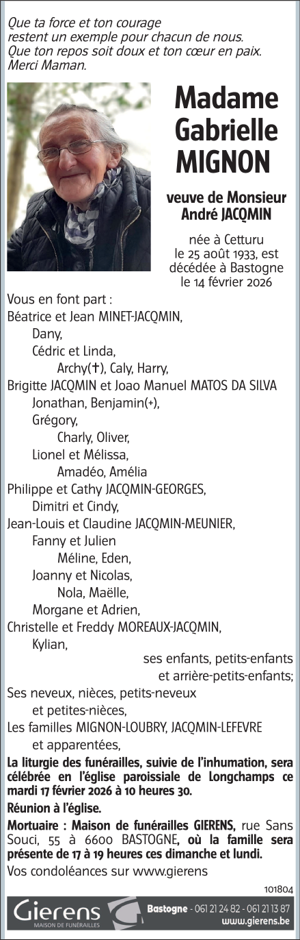 Décédée à Bastogne (6600) le samedi 14 février 2026 à l'âge de 92 ans