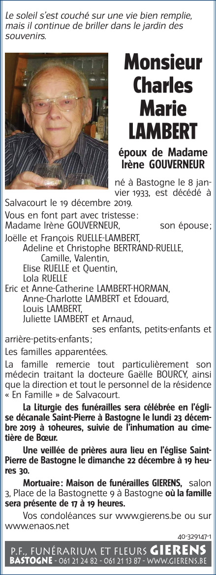 Décédé à Vaux-sur-Sure (6640) le jeudi 19 décembre 2019 à l'âge de 86 ans
