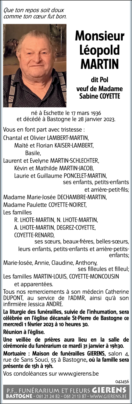 Décédé à Bastogne (6600) le samedi 28 janvier 2023 à l'âge de 86 ans